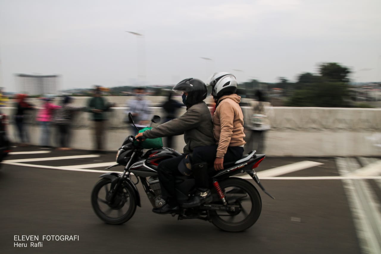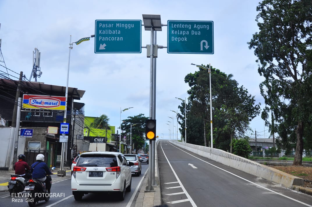 ELEVEN, JAKARTA- Jalan layang Tapal Kuda, Lenteng Agung, Jakarta Selatan telah diuji cobakan untuk umum sejak Minggu (31/01/2021). Sejumlah kendaraan tampak melintasi jalan layang di depan kampus IISIP Jakarta tersebut pada Selasa (02/02/2021).  Diharapkan keberadaan jalan layang ini dapat mengurangi kemacetan, terutama arus lalu lintas di kedua arah Jalan Lenteng Agung Raya.