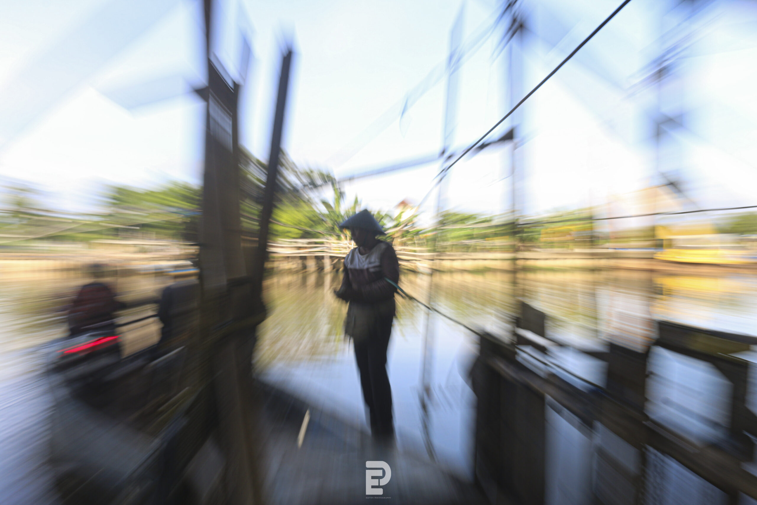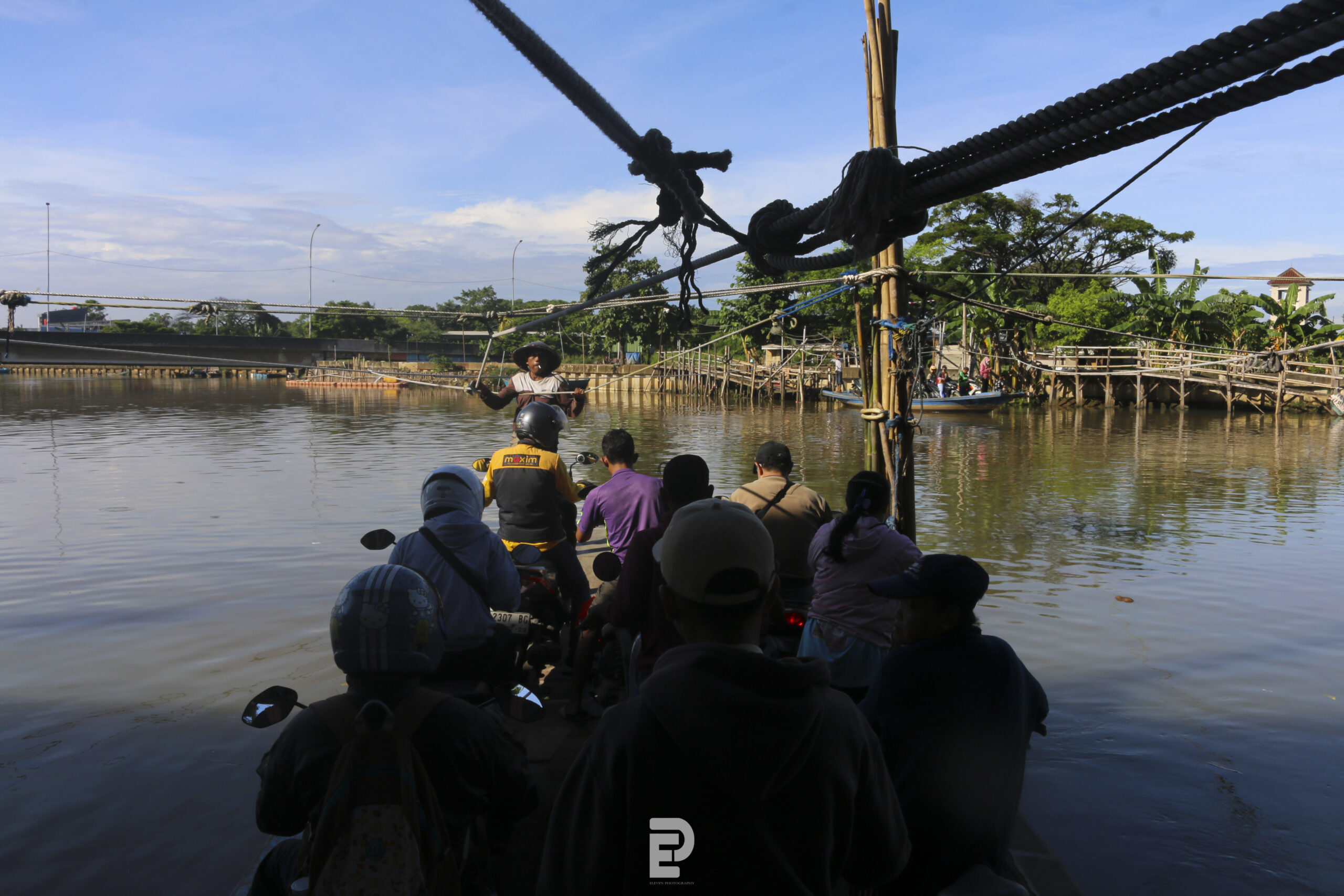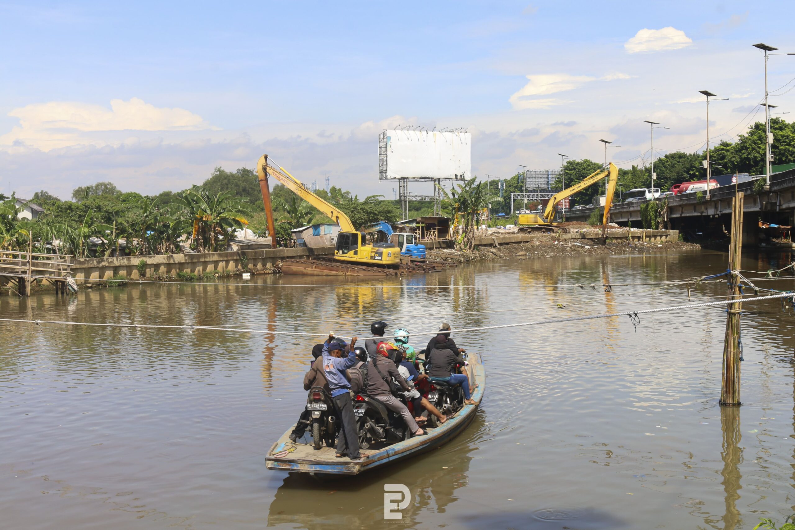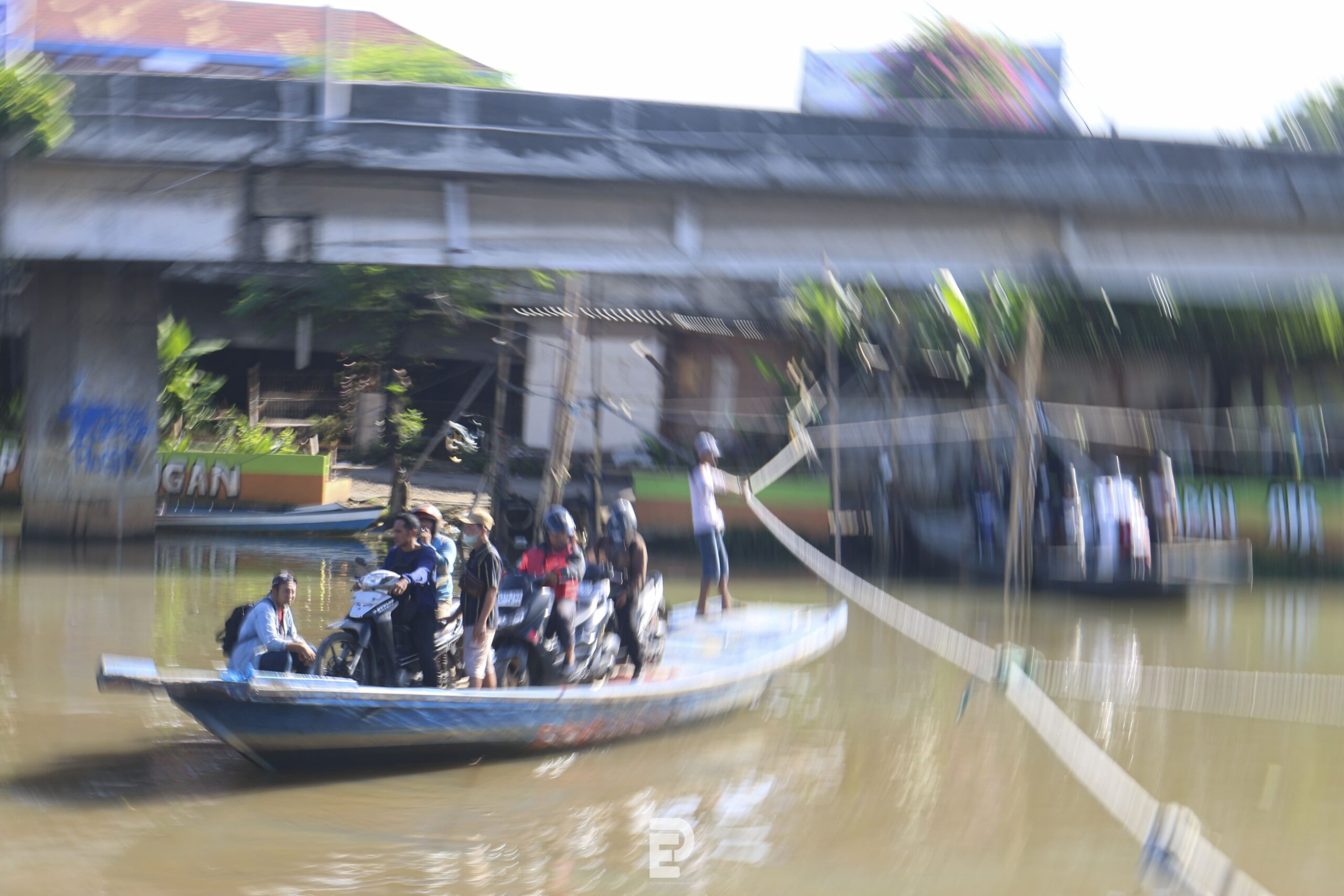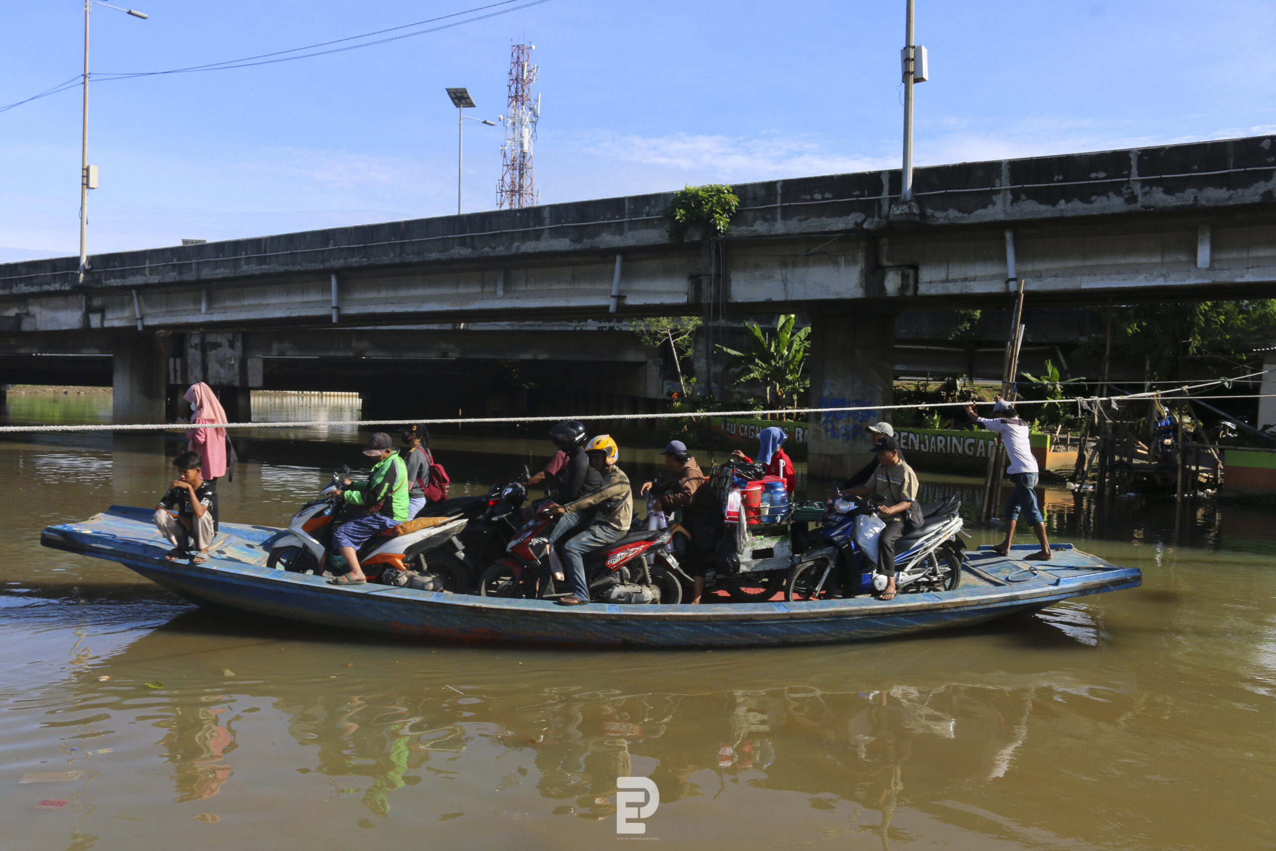 JAKARTA, ELEVEN – Potret jasa perahu eretan di Sungai Angke, Penjaringan, Jakarta Utara, Selasa (05/03/2024). Dengan adanya jasa perahu tersebut, masyarakat sangat terbantu untuk melakukan aktivitas sehari-hari.
