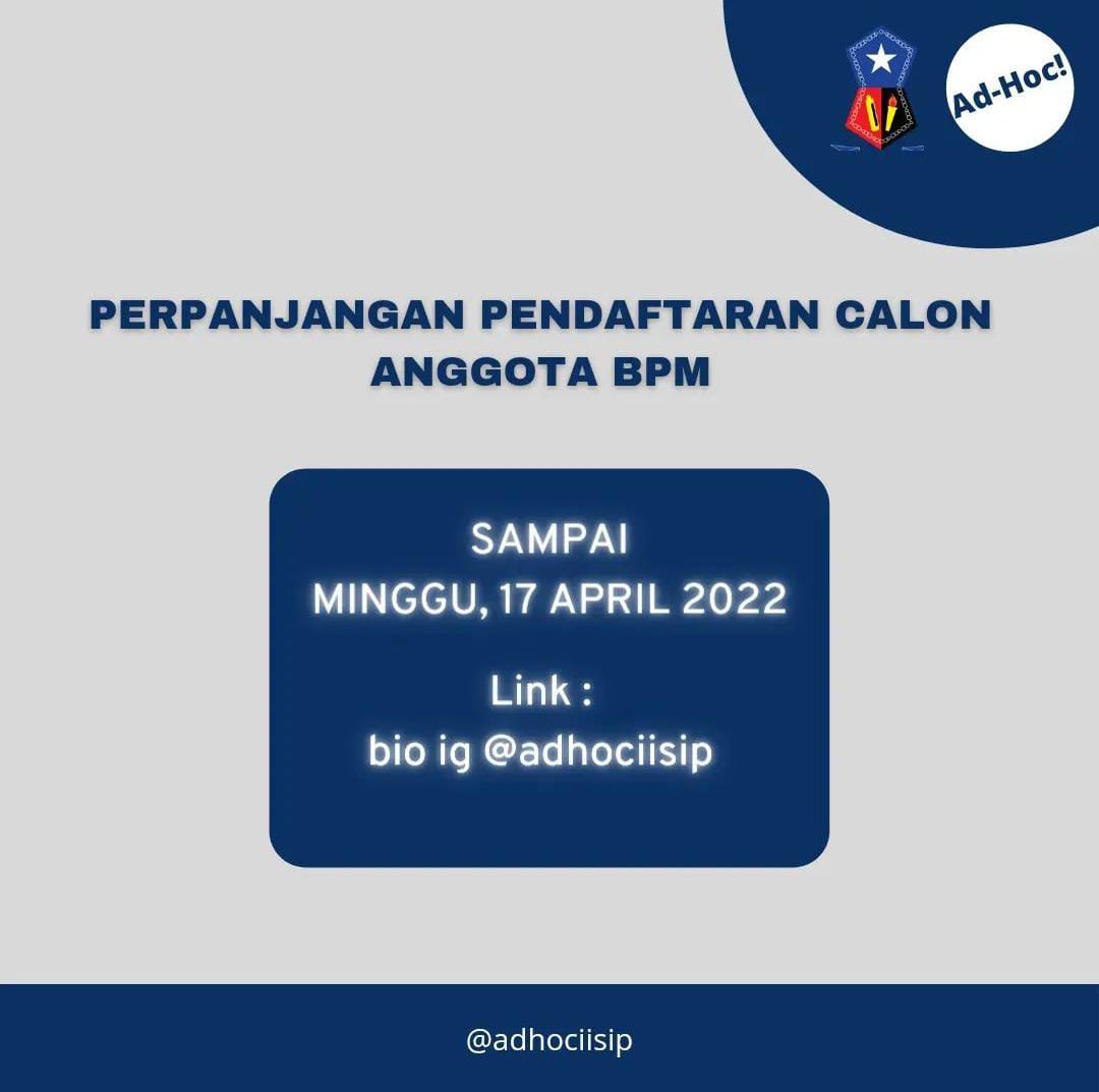 JAKARTA, ELEVEN – Tim adhoc memperpanjang pendaftaran calon anggota BPM sampai Minggu (17/04/2022). Hal ini disebabkan hanya ada satu calon anggota BPM, sehingga tim adhoc mewajibkan setiap Himpunan Mahasiswa (Hima) memberikan perwakilannya.