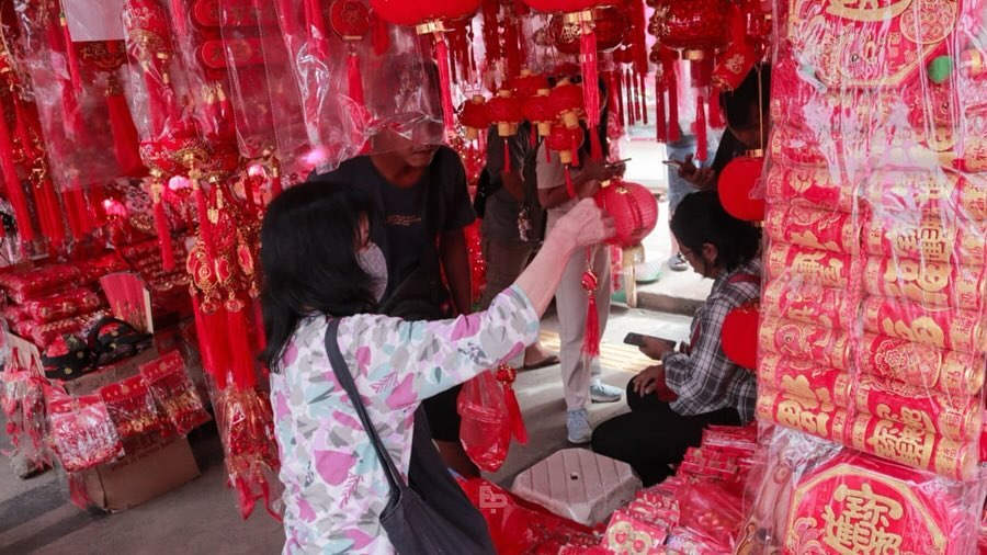 Foto 2 & 3: Pembeli sedang tawar-menawar dengan penjual pernak-pernik Imlek, Kamis (09/01/2025).
