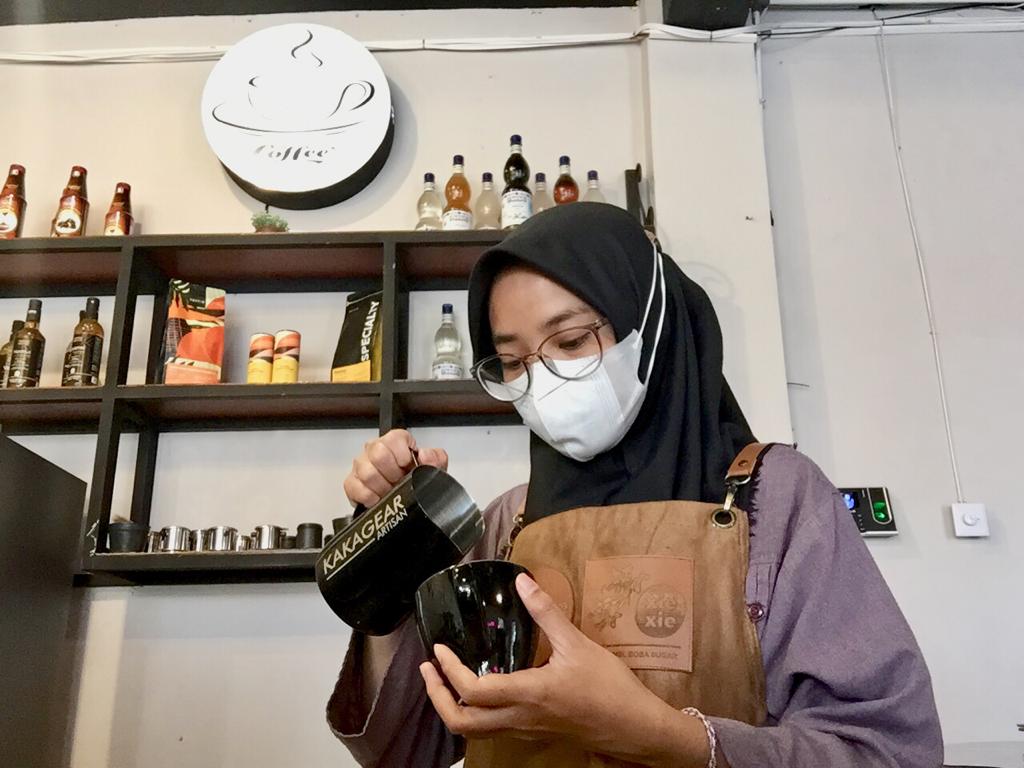 Rini sedang membuat kopi dengan latte art